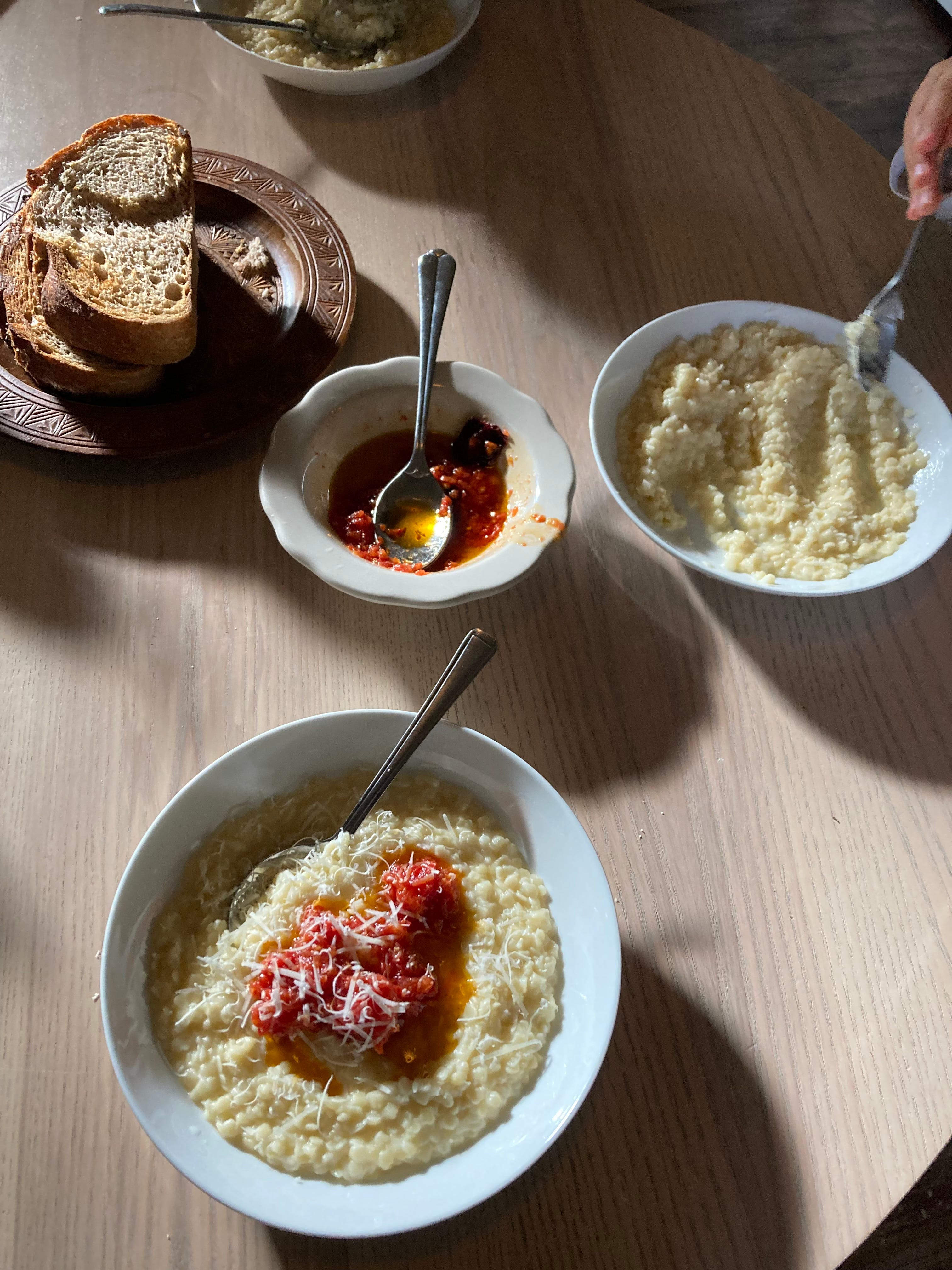 Yesterday we had our first Sunday lunch — I made a simple trahana with fresh tomato sauce. It was jolly good! For those who aren’t familiar, trahana is a fermented grain pasta, a true staple of Greek cuisine — I like to call it the Greek porridge!